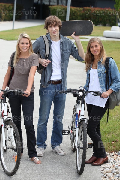 Студенты с велосипедами и скейтбордом