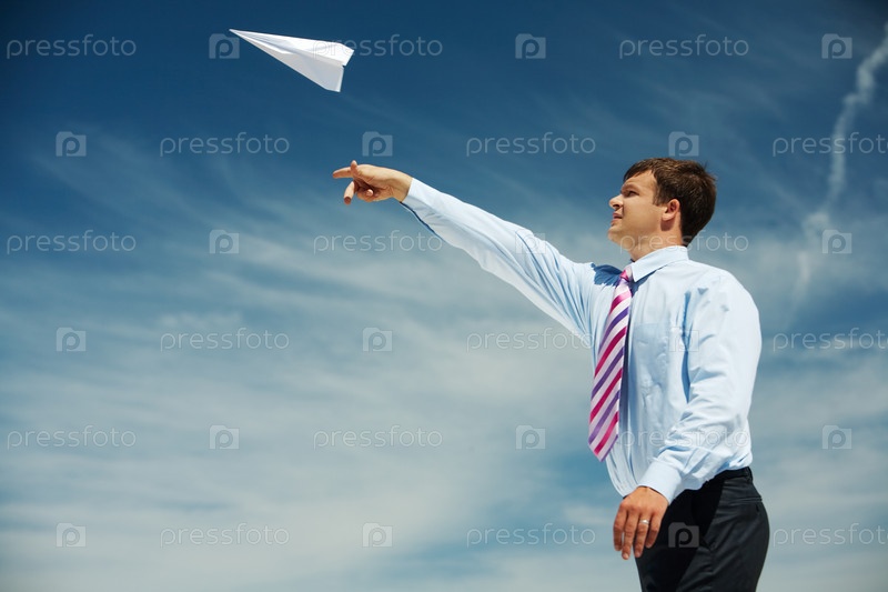 Бизнесмен запускает бумажный самолетик в небо