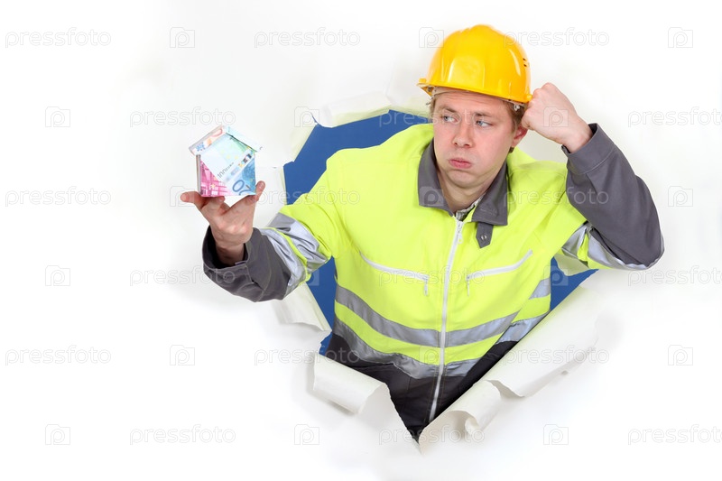 Рабочий показывает дом из купюр