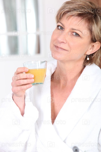 Женщина в халате пьет апельсиновый сок