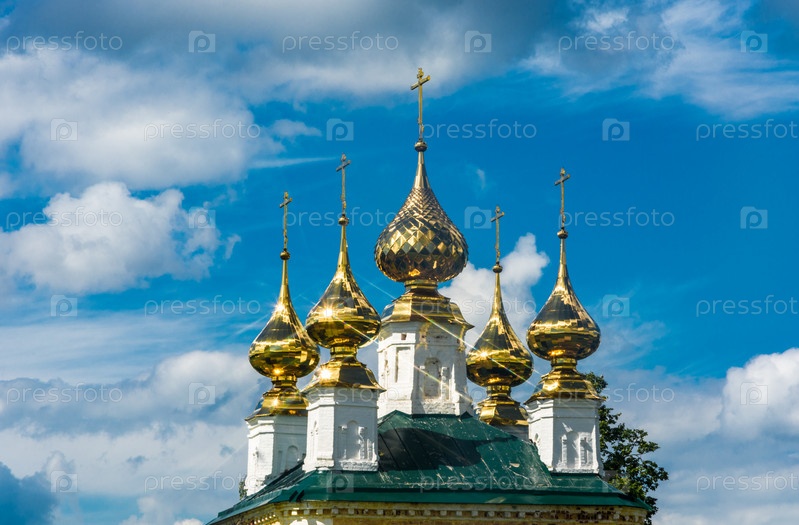 Золотые церковные купола на фоне голубого неба с красивыми облаками
