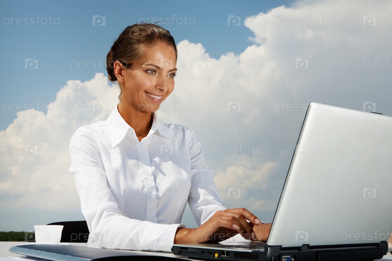 Деловая женщина печатает на ноутбуке на свежем воздухе
