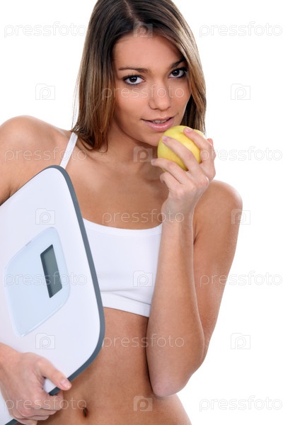Спортивная женщина с весами и яблоком