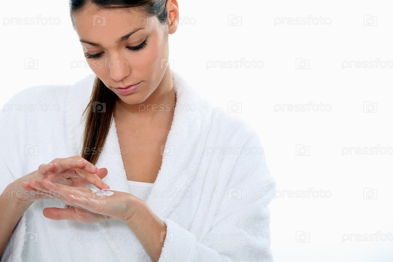 Брюнетка наносит крем для рук