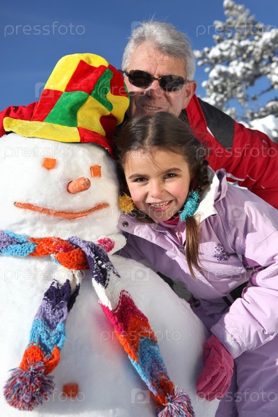 Мужчина и маленькая девочка со снеговиком