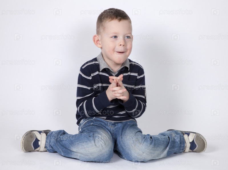 Мальчик в полосатом свитере сидит на белом фоне