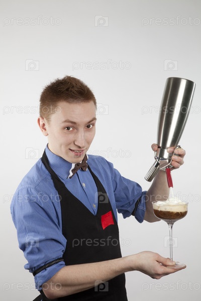 Молодой бармен наполняет бокал из шейкера
