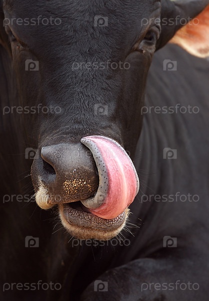 Огромный черный бык смотрит прямо, облизываясь