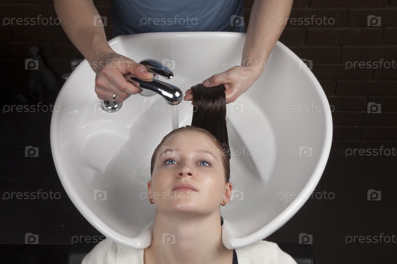 Девушка наслаждается мытьем волос в парикмахерской
