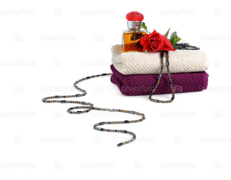 Флакон духов, красная роза и бусы на сложенных полотенцах
