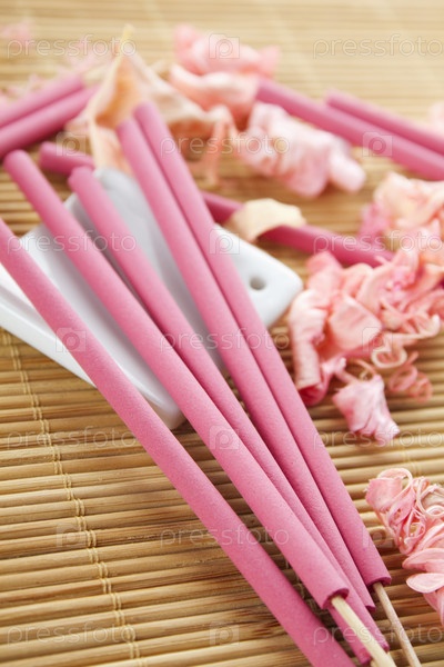 Ароматические палочки и розовые цветочные лепестки на бамбуковой салфетке