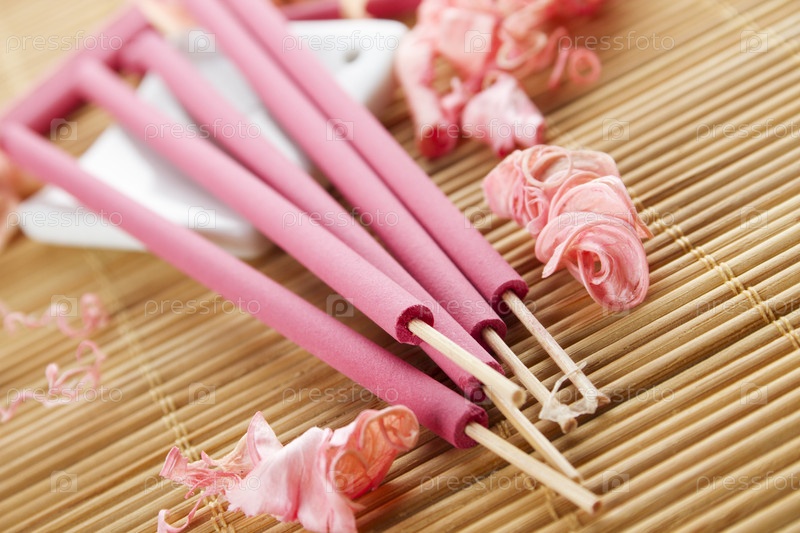 Ароматические палочки и розовые цветочные лепестки на бамбуковой салфетке