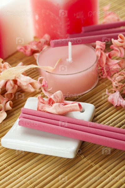 Ароматические палочки, свечи и розовые цветочные лепестки на бамбуковой салфетке