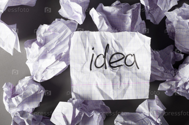 Мятые листы бумаги со словом "Идея" на сером фоне