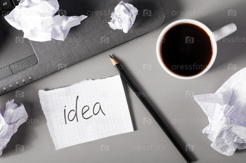Ноутбук, чашка кофе, карандаш и мятые листы бумаги со словом "Идея" на столе