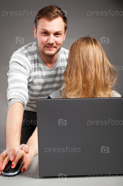 Мужчина и женщина с волосами на лице перед ноутбуком на сером фоне