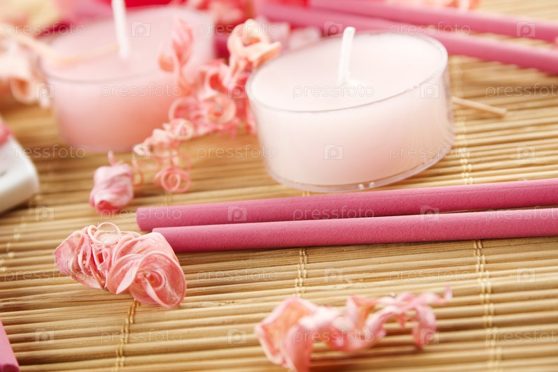 Ароматические палочки, свечи и розовые цветочные лепестки на бамбуковой салфетке