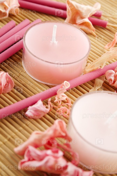 Ароматические палочки, свечи и розовые цветочные лепестки на бамбуковой салфетке