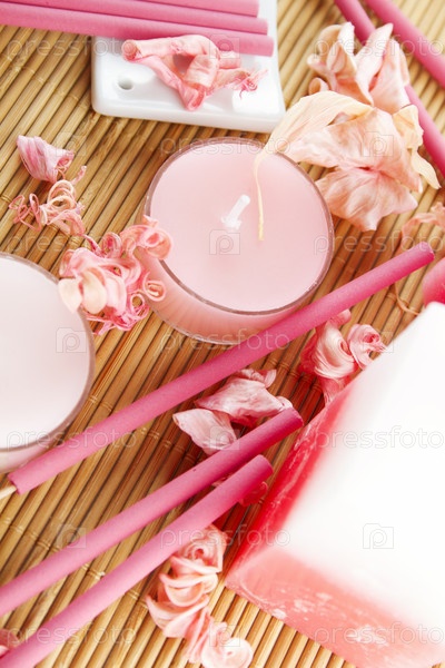 Ароматические палочки, свечи и розовые цветочные лепестки на бамбуковой салфетке
