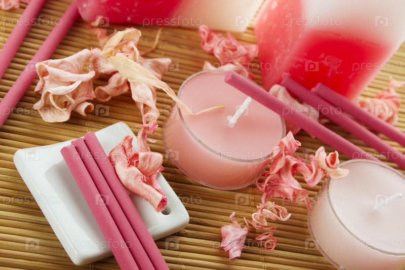Ароматические палочки, свечи и розовые цветочные лепестки на бамбуковой салфетке