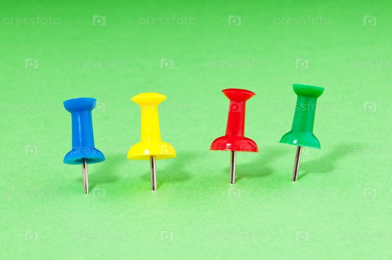 Четыре цветных канцелярских кнопки в зеленой бумаге