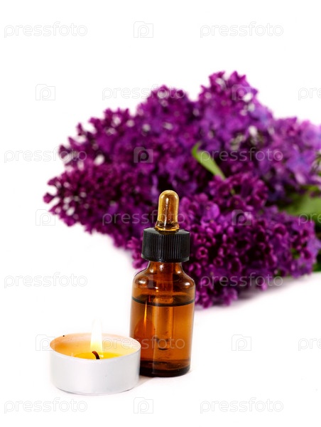 Сирень, ароматное масло и свеча на белом фоне