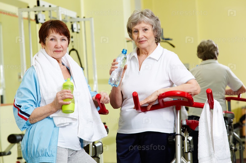Пожилые подруги в тренажерном зале после занятий