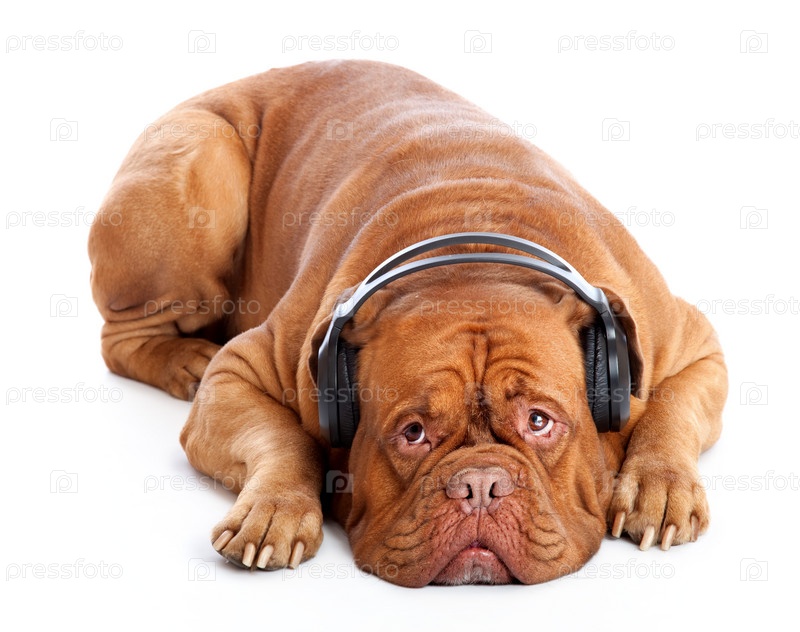 Французский мастиф лежит в наушниках
