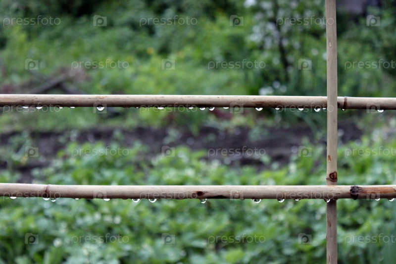 Мокрый забор в саду во время дождя