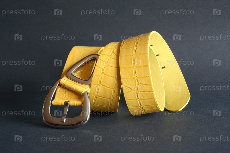 Желтый ремень с металлической пряжкой на темном фоне
