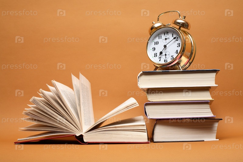Будильник на стопке книг и открытая книга, лежащая рядом