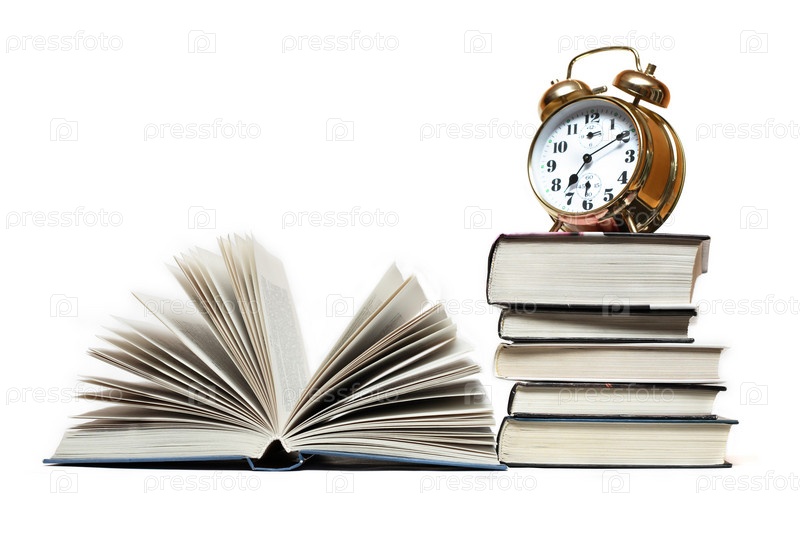Будильник на стопке книг и открытая книга, лежащая рядом