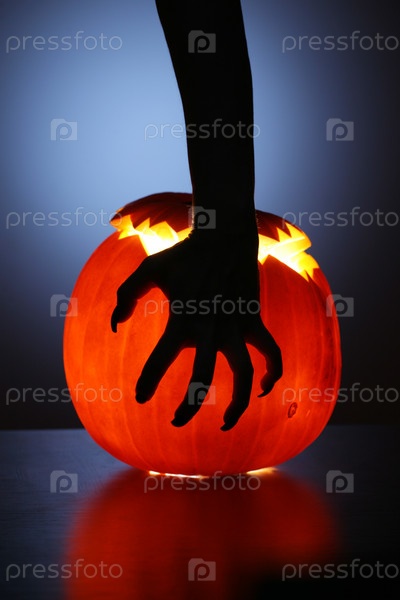Человеческая рука на светящейся вырезанной тыкве