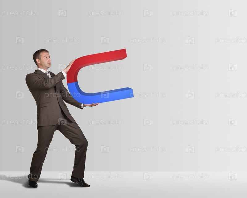 Бизнесмен в костюме держит большой магнит
