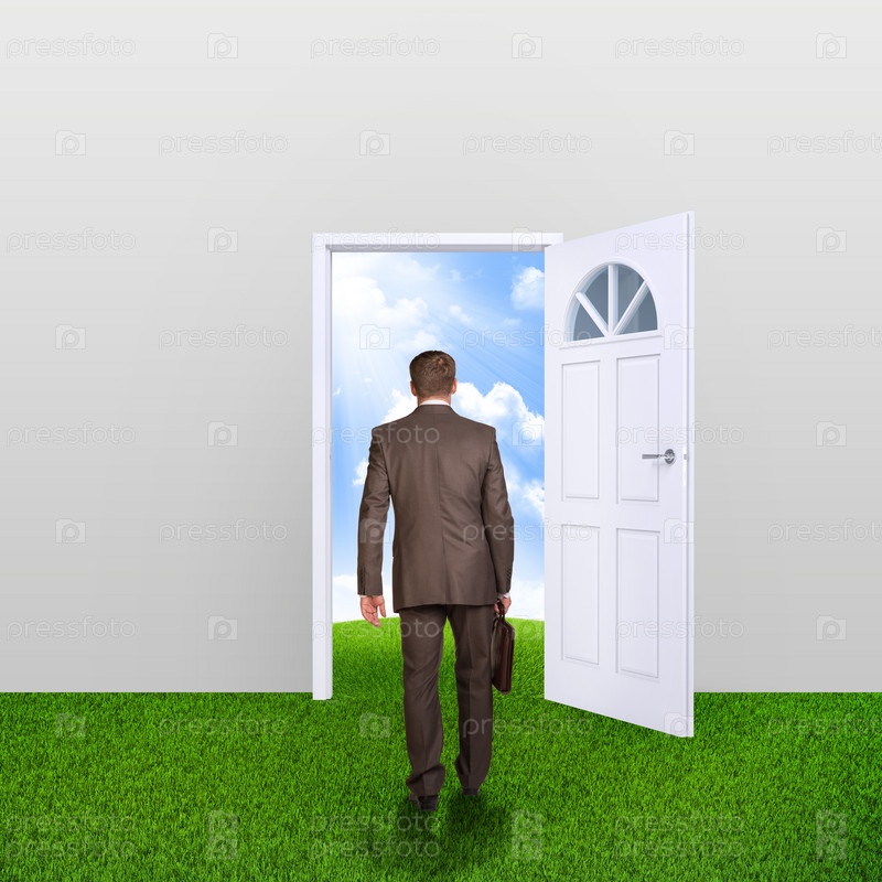 Бизнесмен с портфелем идет в дверь