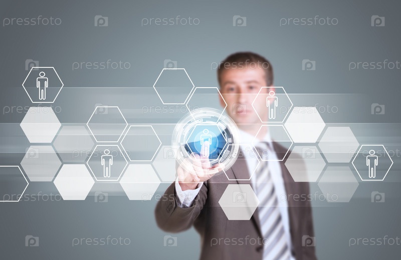 Бизнесмен нажимает виртуальную кнопку