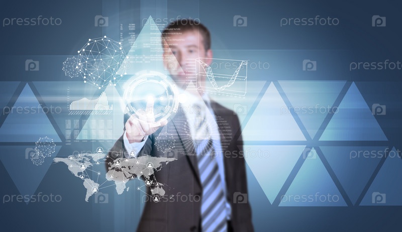Бизнесмен нажимает виртуальную кнопку