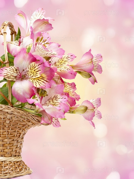 Розовые цветы в плетеной корзине на абстрактном фоне