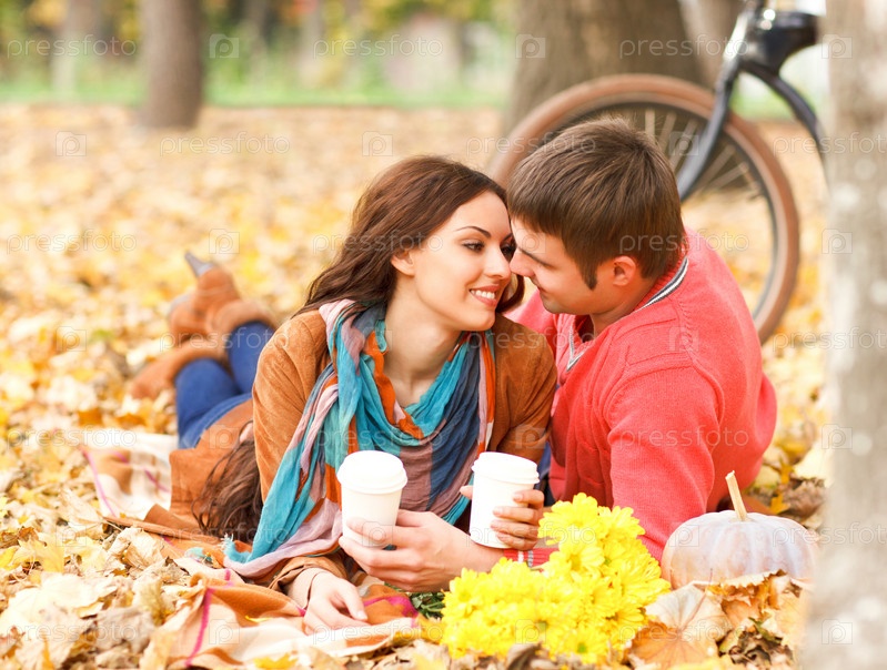 Счастливая пара с велосипедом в осеннем парке