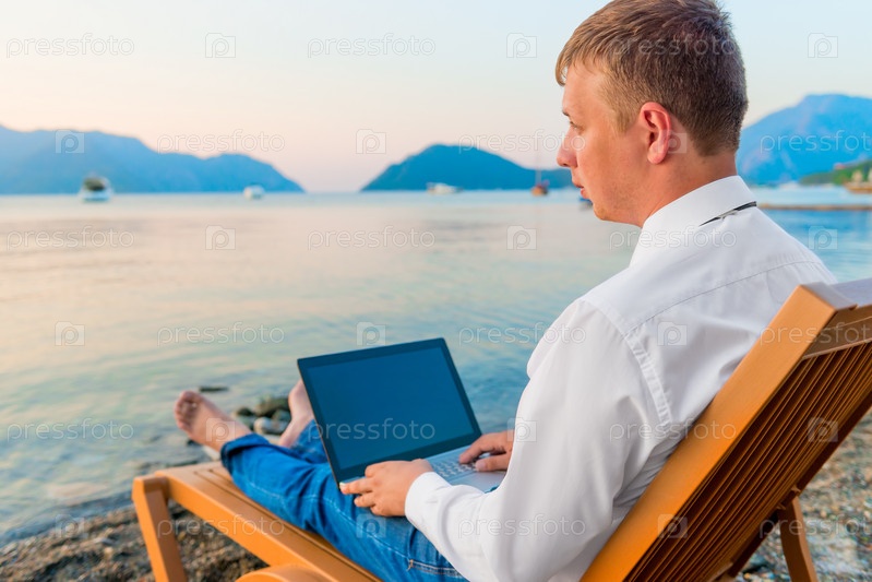 Бизнесмен работает на пляже