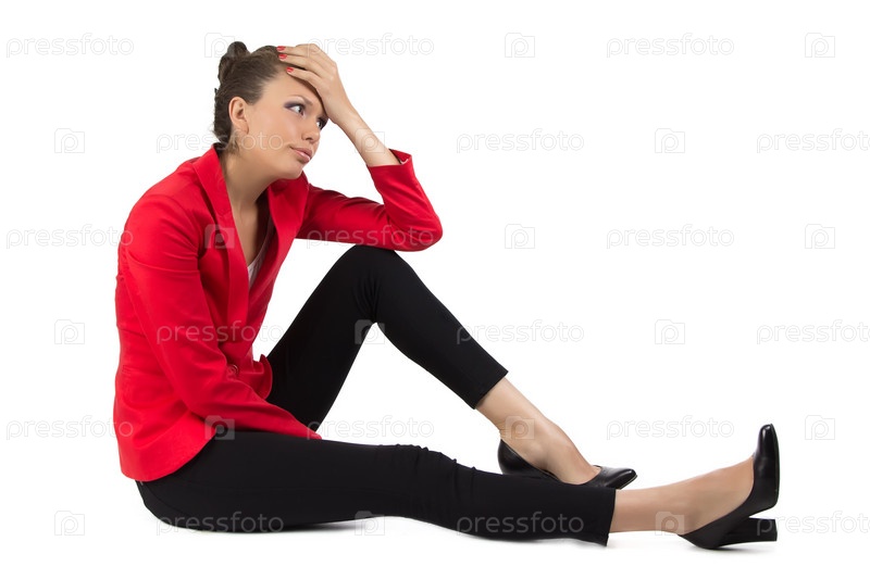 Бизнес-леди сидит на белом фоне