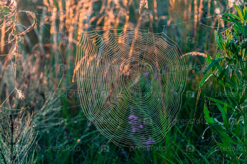 Яркая, красивая паутина в красном контровом свете восходящего солнца