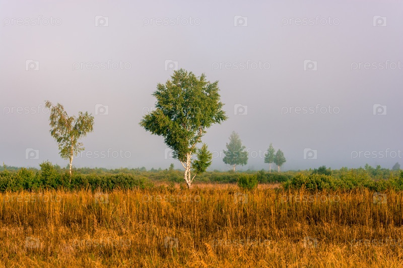 Молодые березки в утреннем тумане. На переднем плане высохшая оранжевая трава