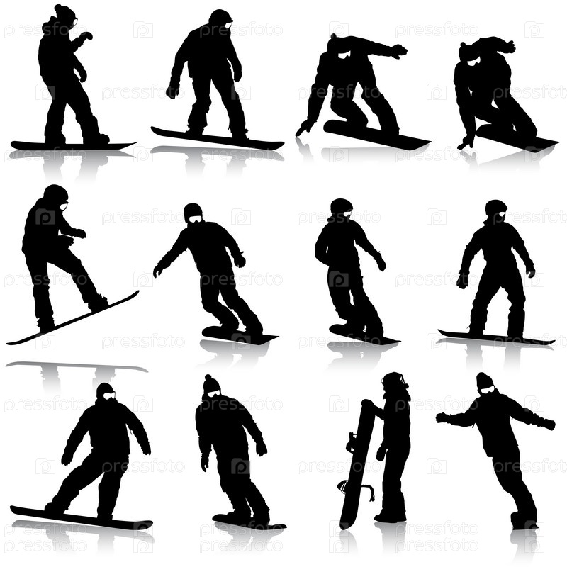 Черные силуэты сноубордистов на белом фоне