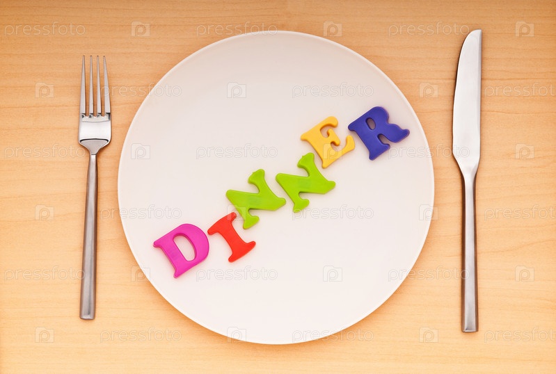 Столовые приборы и тарелка с выложенным на ней словом 'Dinner'