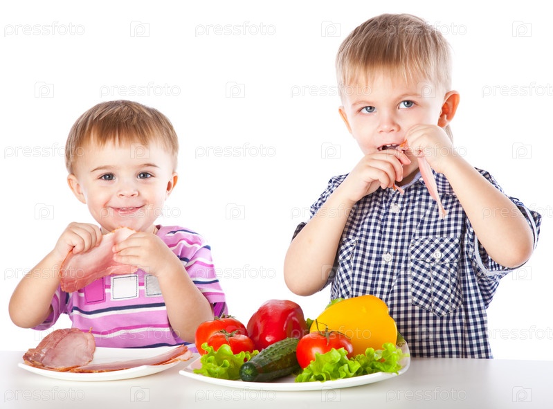 Овощи и мясная нарезка в тарелках, стоящих перед мальчиками