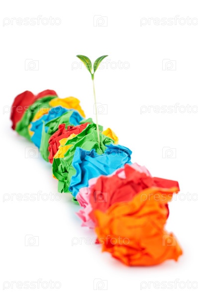 Зеленый росток, пробивающийся сквозь мятую бумагу