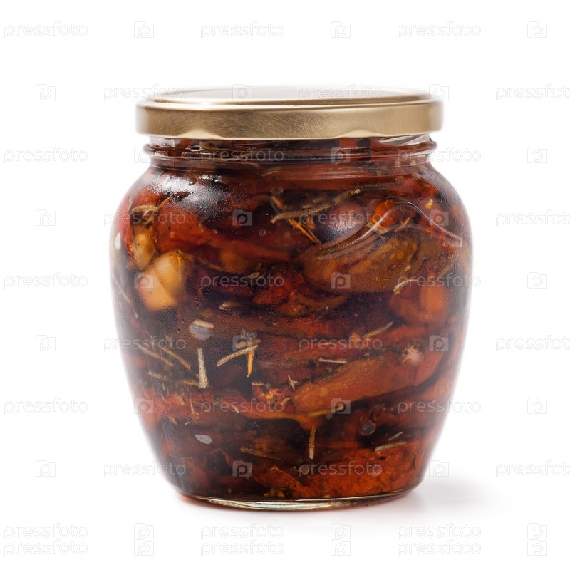 Вяленые помидоры в банке, изолированные на белом фоне