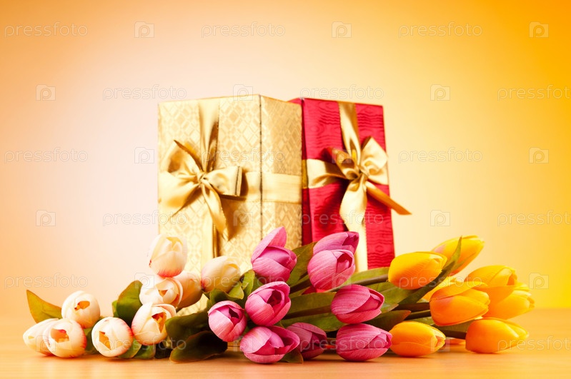 Подарочные коробки и букет тюльпанов