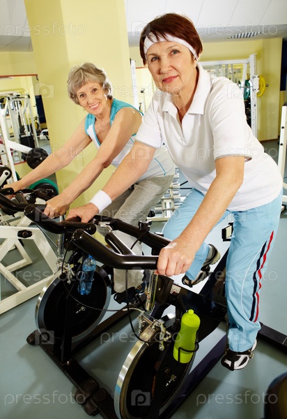 Две женщины занимаются на велотренажерах в спортивном клубе